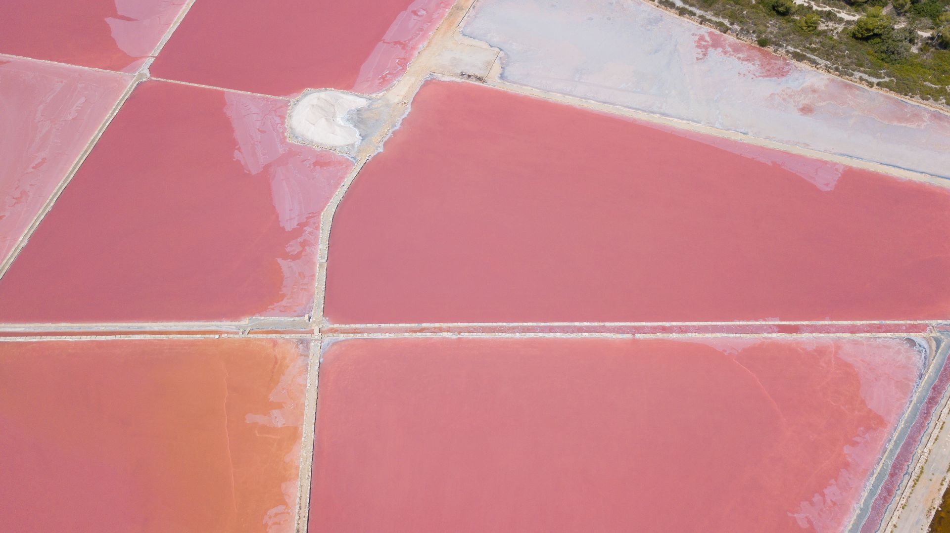 The accumulation of brine shrimp is produced by an increase in the salinity and temperature of the water. This makes artificial lagoons look rosy weeks before they dry up completely and the salt can be extracted.